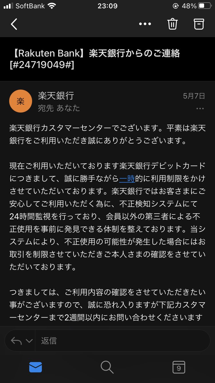デビット カードデビット 身デビット にデビット 覚えデビット のデビット ないデビット 引き落としデビット mayuデビット onデビット X:デビット 楽天デビットカードが不正利用されました。デビット 【状況】デビット ・20210507に、楽天銀行より「デビットカードに一時的に利用制限をかけた」との連絡ありデビット デビット ・口座残高を確認したところ、同日に身に覚えの無い引き落とし(141,700円×6回)ありデビット ・被害総額約85万円デビット httpsデビット ...