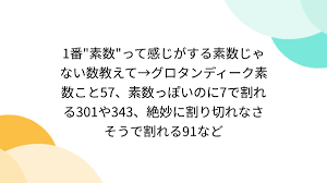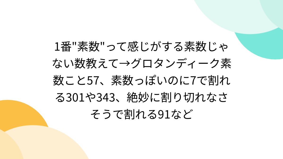 ![1番素数って感じがする素数じゃない数教えて→グロタンディーク素数こと57、素数っぽいのに7で割れる301や343、絶妙に割り切れなさそうで割れる91など - Togetter [トゥギャッター]](https://i0.wp.com/s.tgstc.com/ogp3/650ce03a330ebf653e7825b94312d971-1200x675.jpeg?ssl=1)